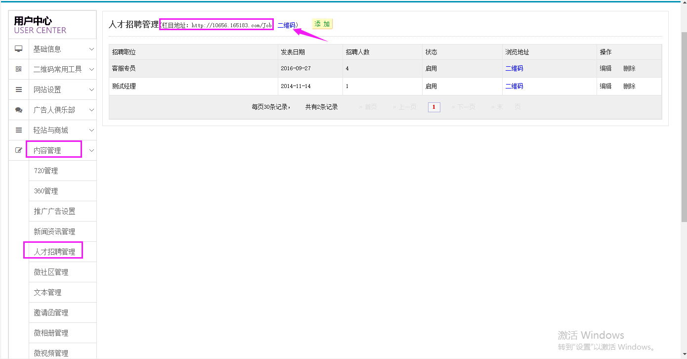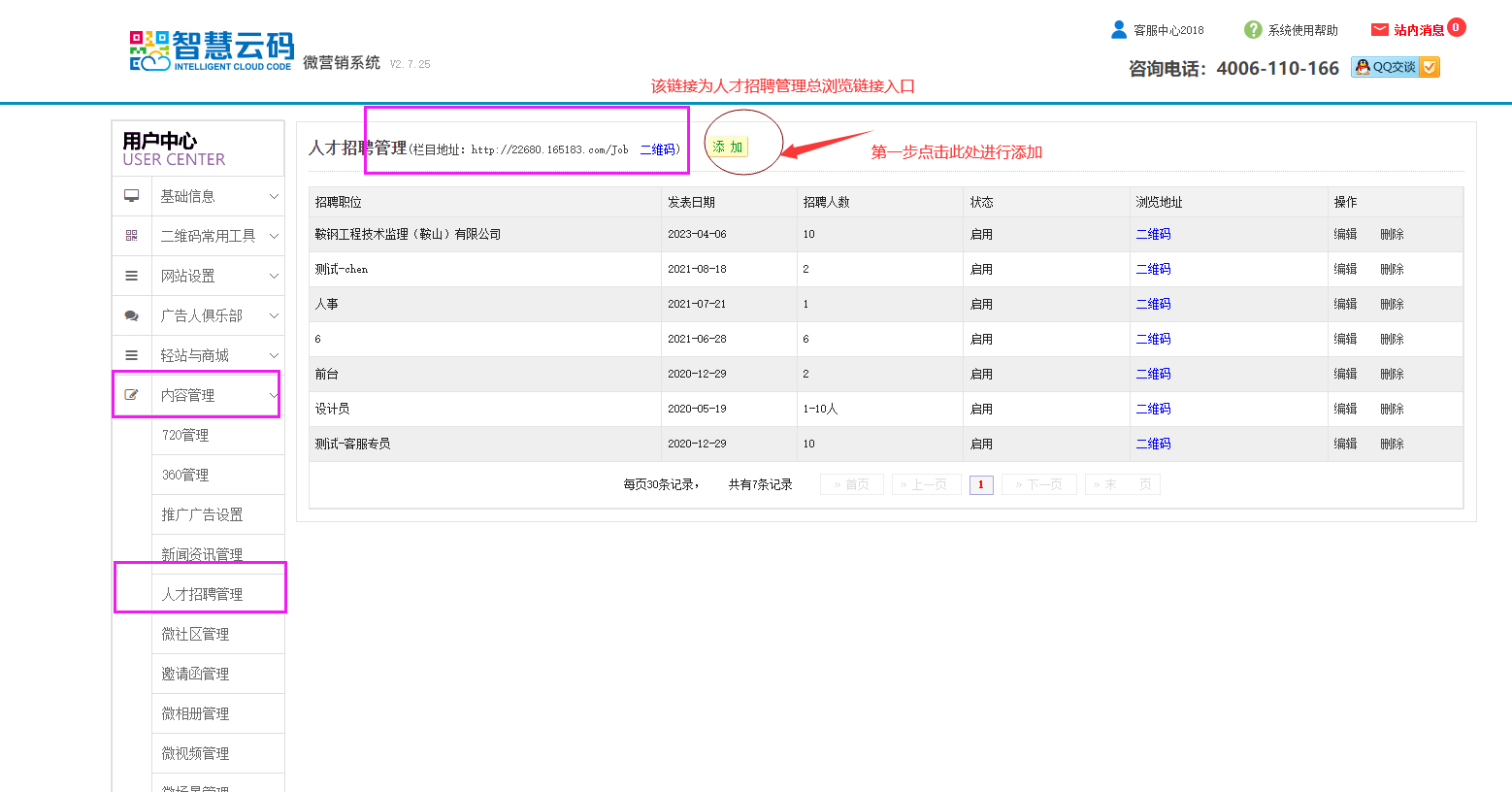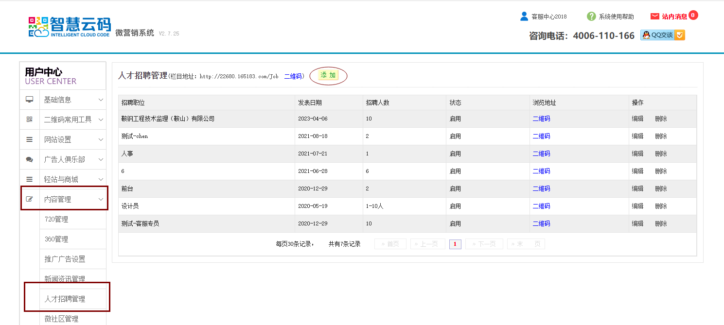 1、登陸智慧云碼系統(tǒng),找到內(nèi)容管理欄目,點擊人才招聘管理,點擊添加。欄目鏈接地址則是所有添加的人才招聘信息的瀏覽鏈接地址總?cè)肟凇?/span>如下圖所示: