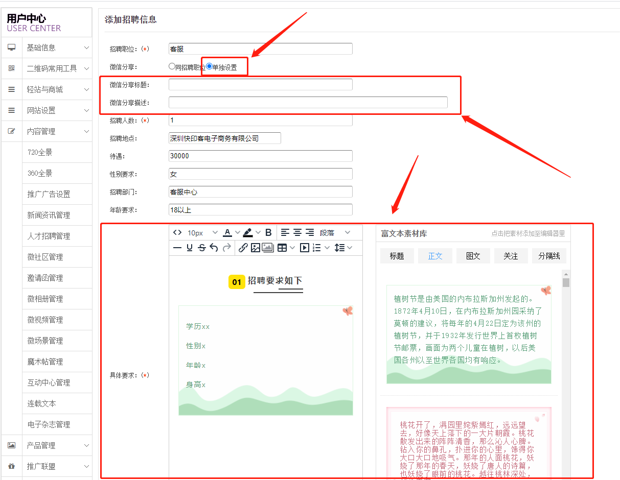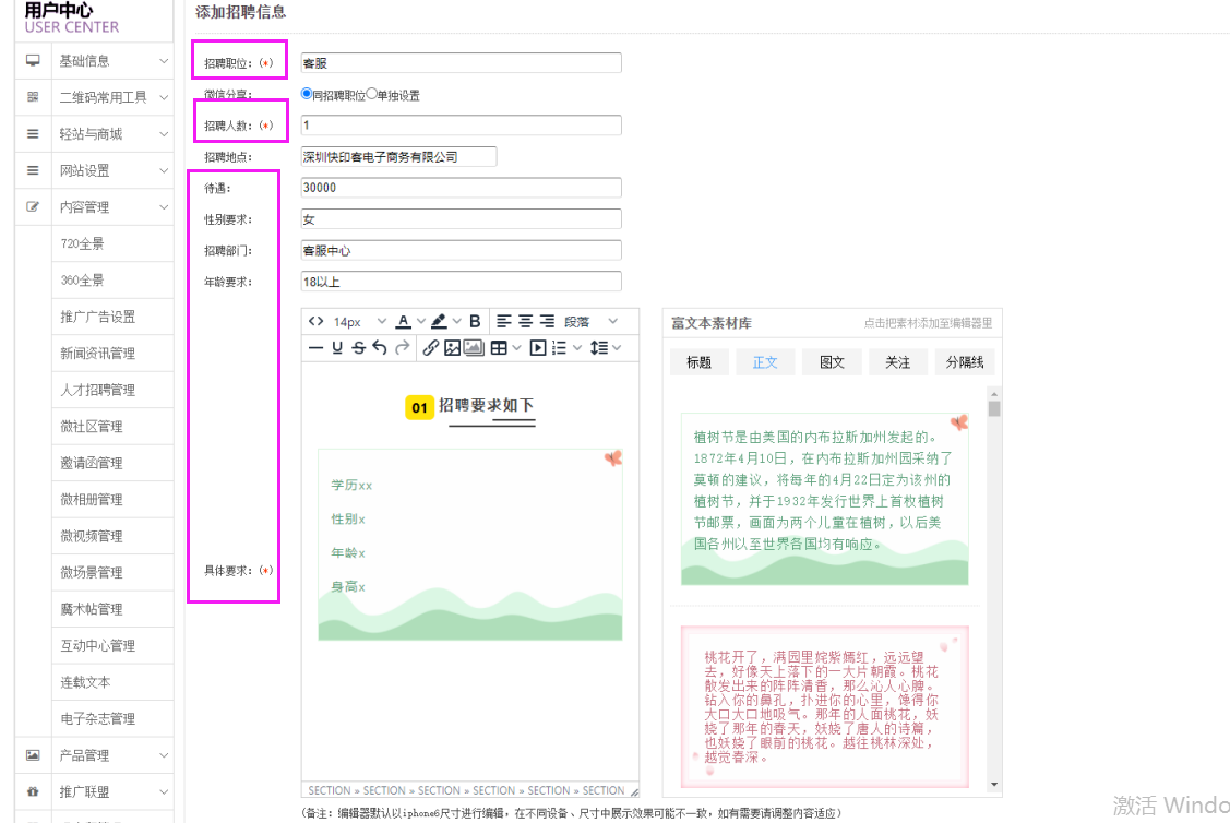 注意:人才招聘管理只能添加相關(guān)文字,沒有上傳圖片的功能。