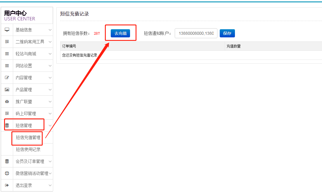 注意:如果賬號沒有購買短信服務(wù),是收不到驗證碼短信的,請到短信管理中購買短信服務(wù)。