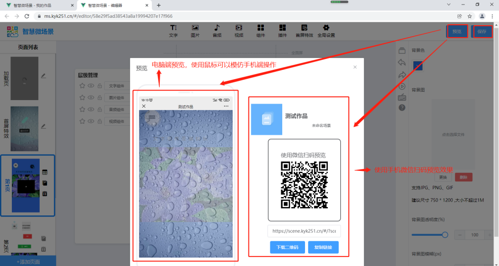 作品分享方式有兩種: 二維碼分享預覽、鏈接分享預覽。如下圖所示: