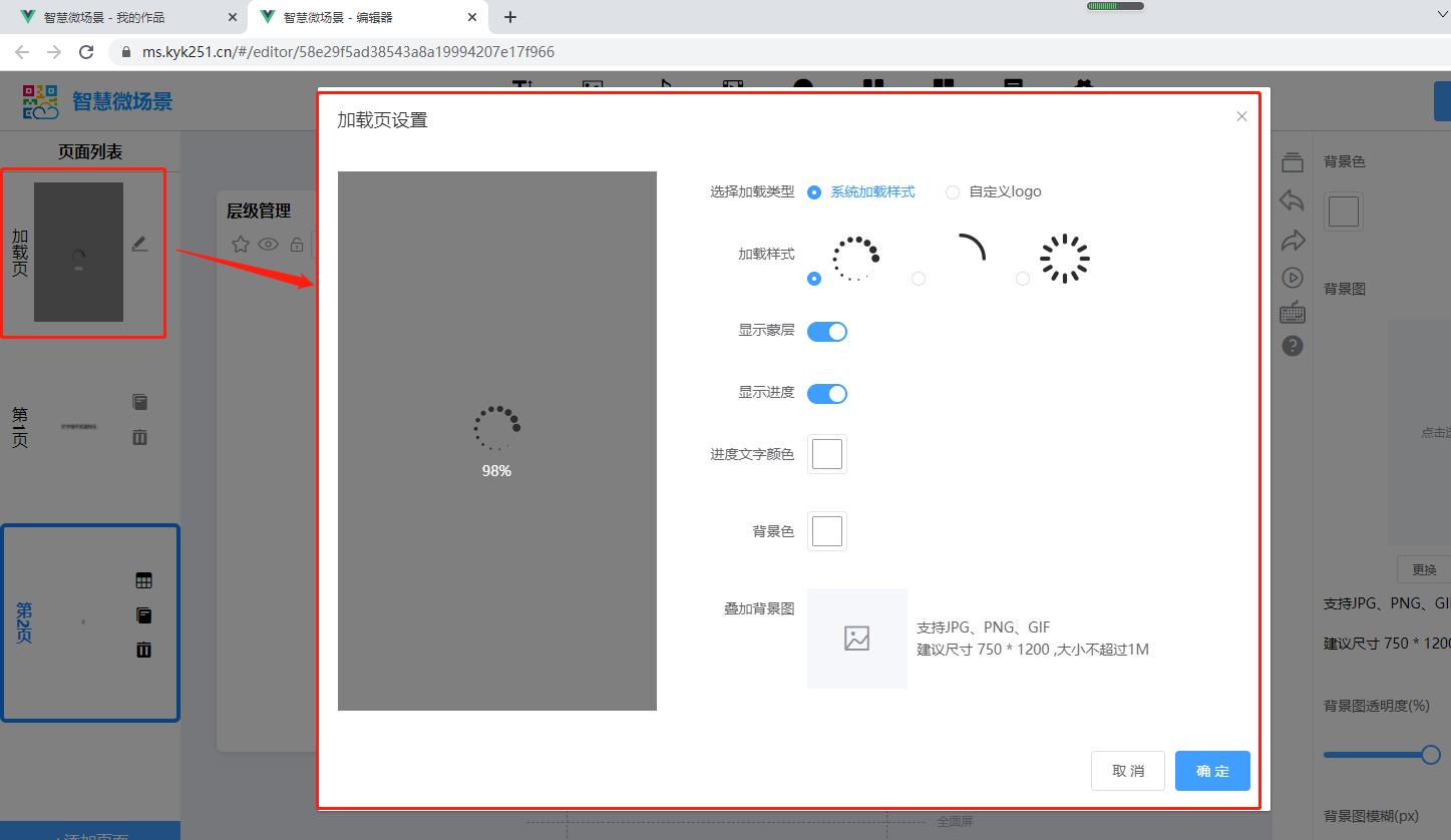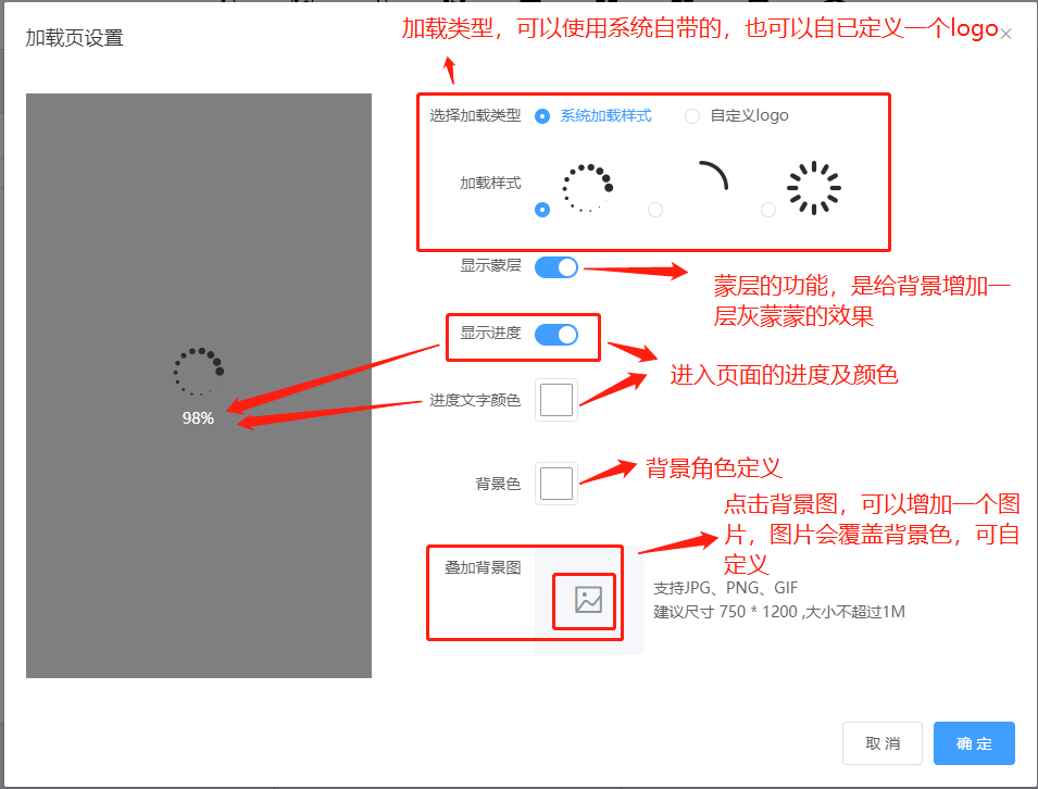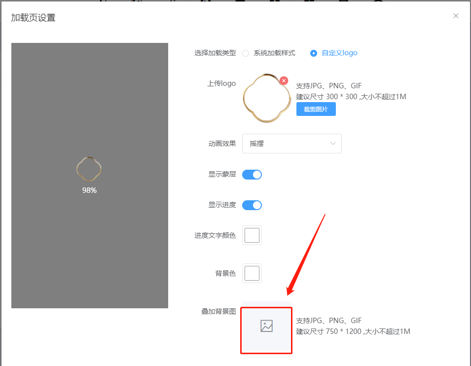 同理,設置加載頁的疊加背景圖,也是同樣的操作,點擊背景圖標可以選擇背景圖或者上傳圖片。編輯完成后,點擊【確定】按鈕保存即可。如下圖所示: