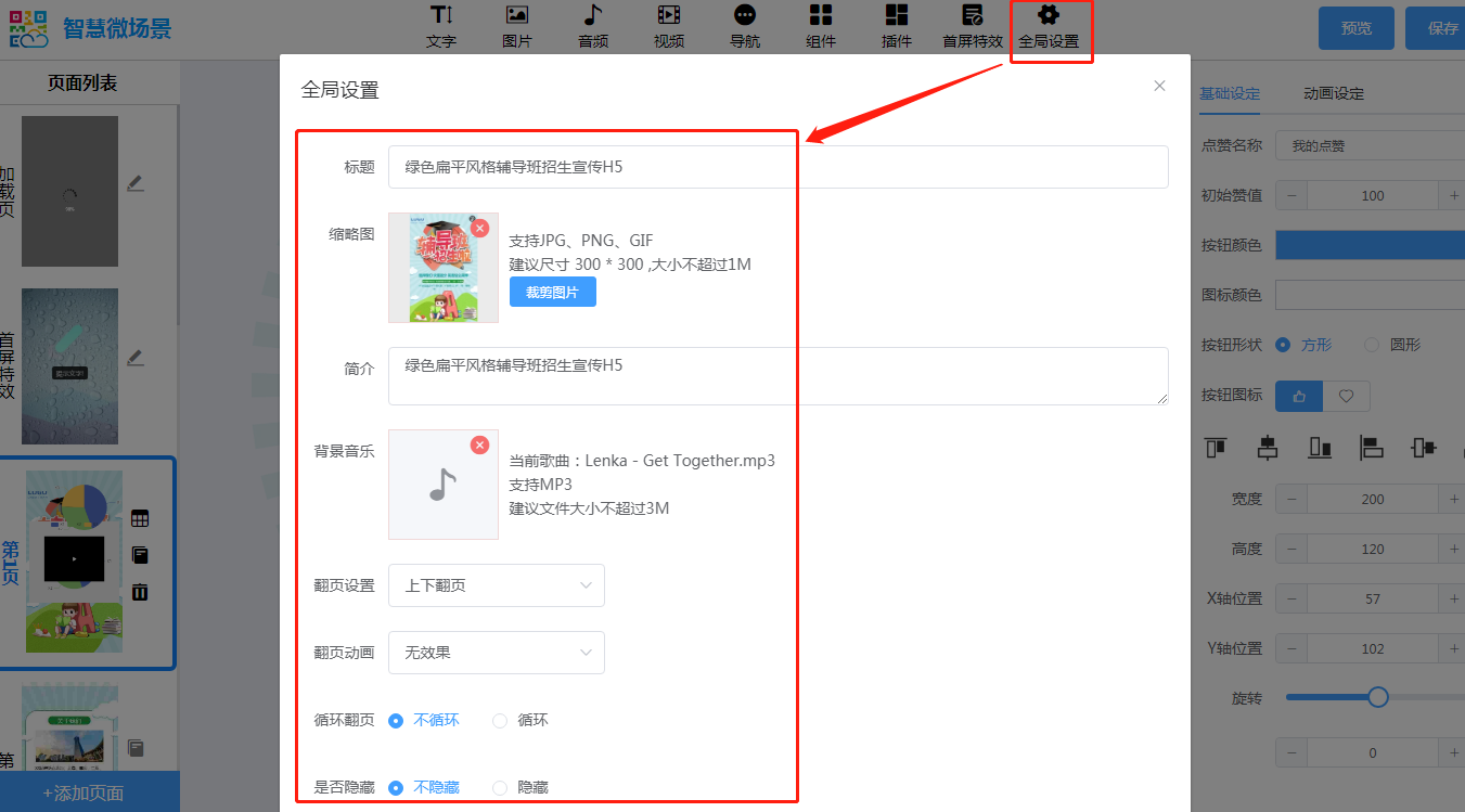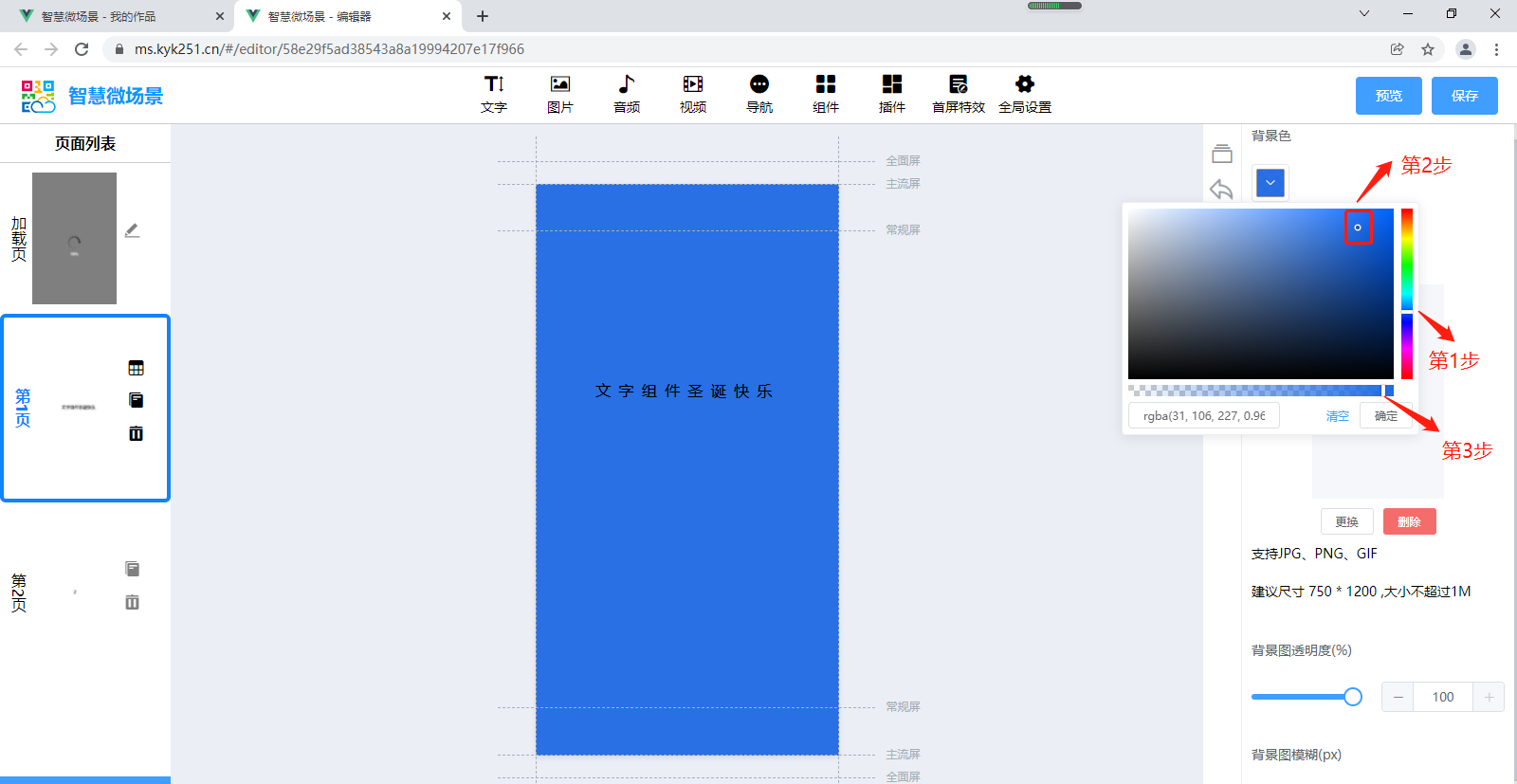 頁面設置包含:背景色、背景圖、背景圖透明度、背景圖模糊