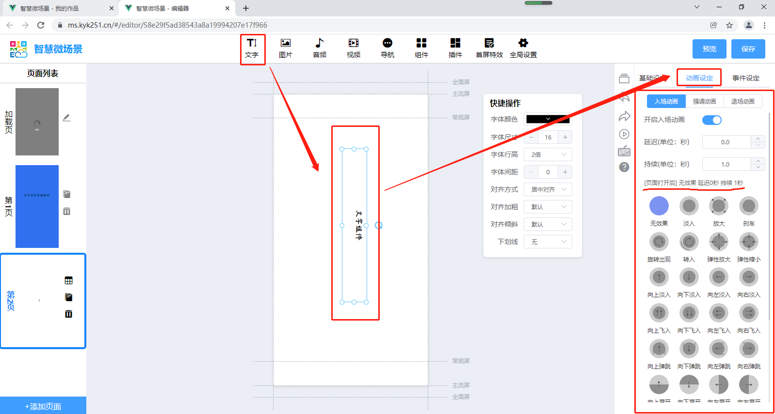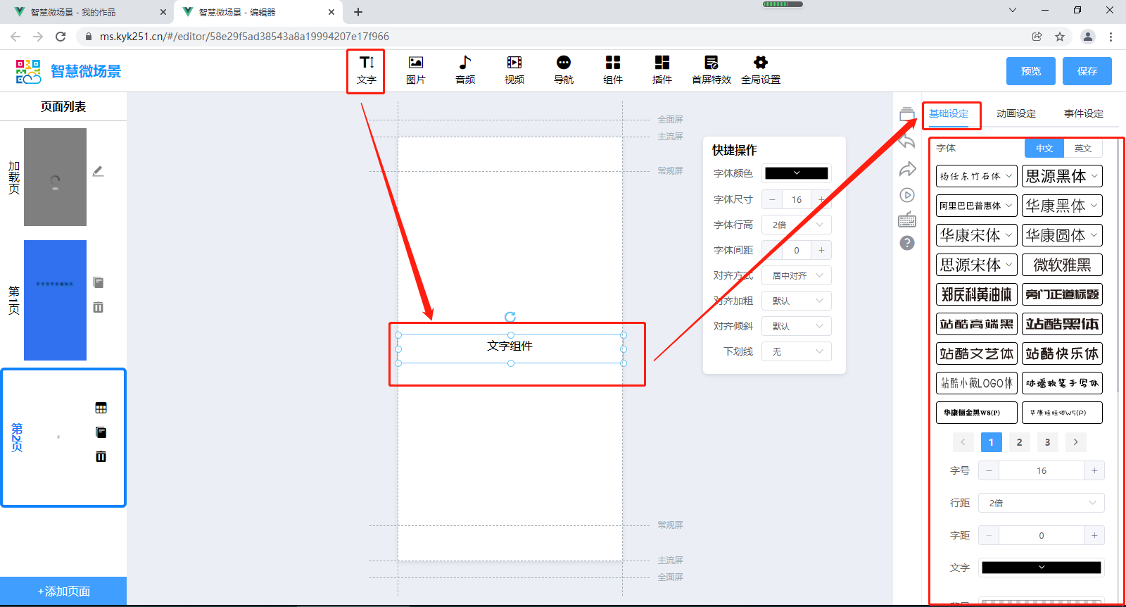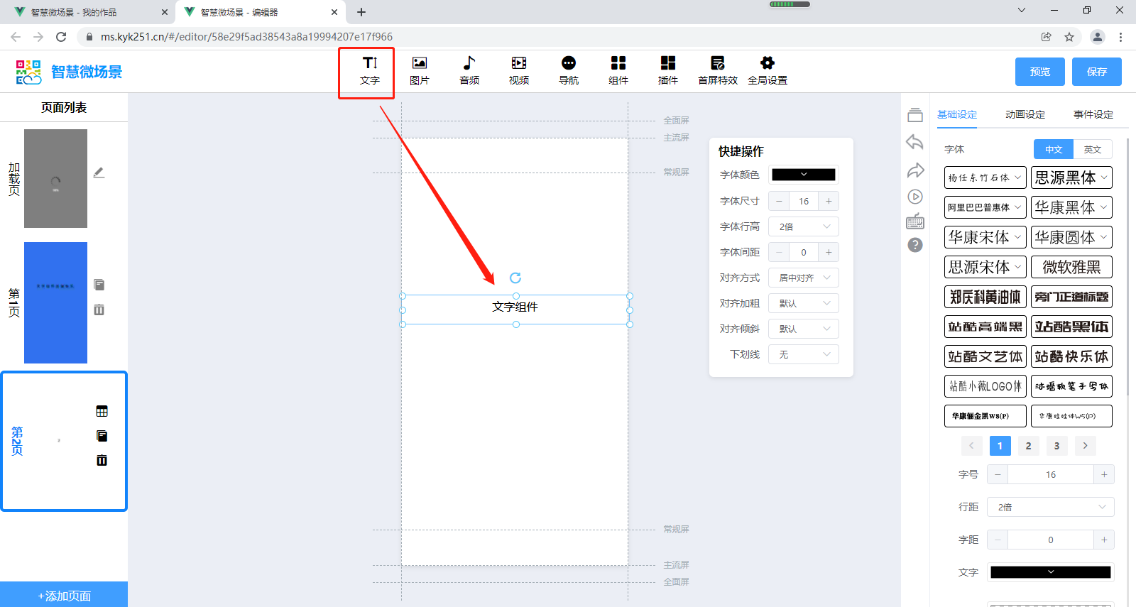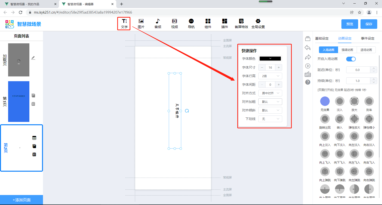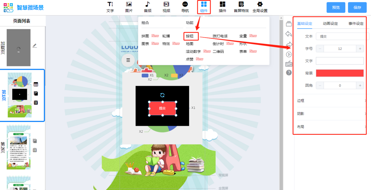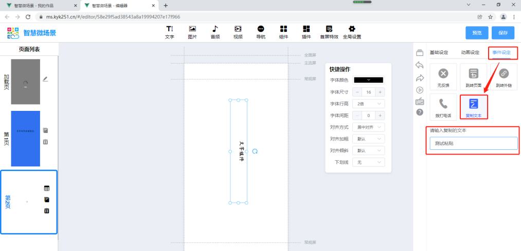 可在右側針對文字組件編輯,有三個設定:基礎設定、動畫設定、事件設定。