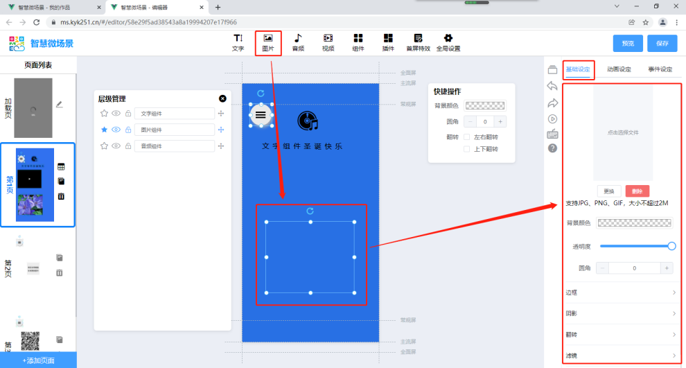 可在右側針對圖片組件編輯,有三個設定:基礎設定、動畫設定、事件設定。(跟上方文字組件的設定一致);如下圖所示: