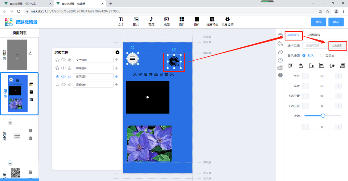 上傳或者更換音頻:點擊音頻,基礎設定,點擊選取