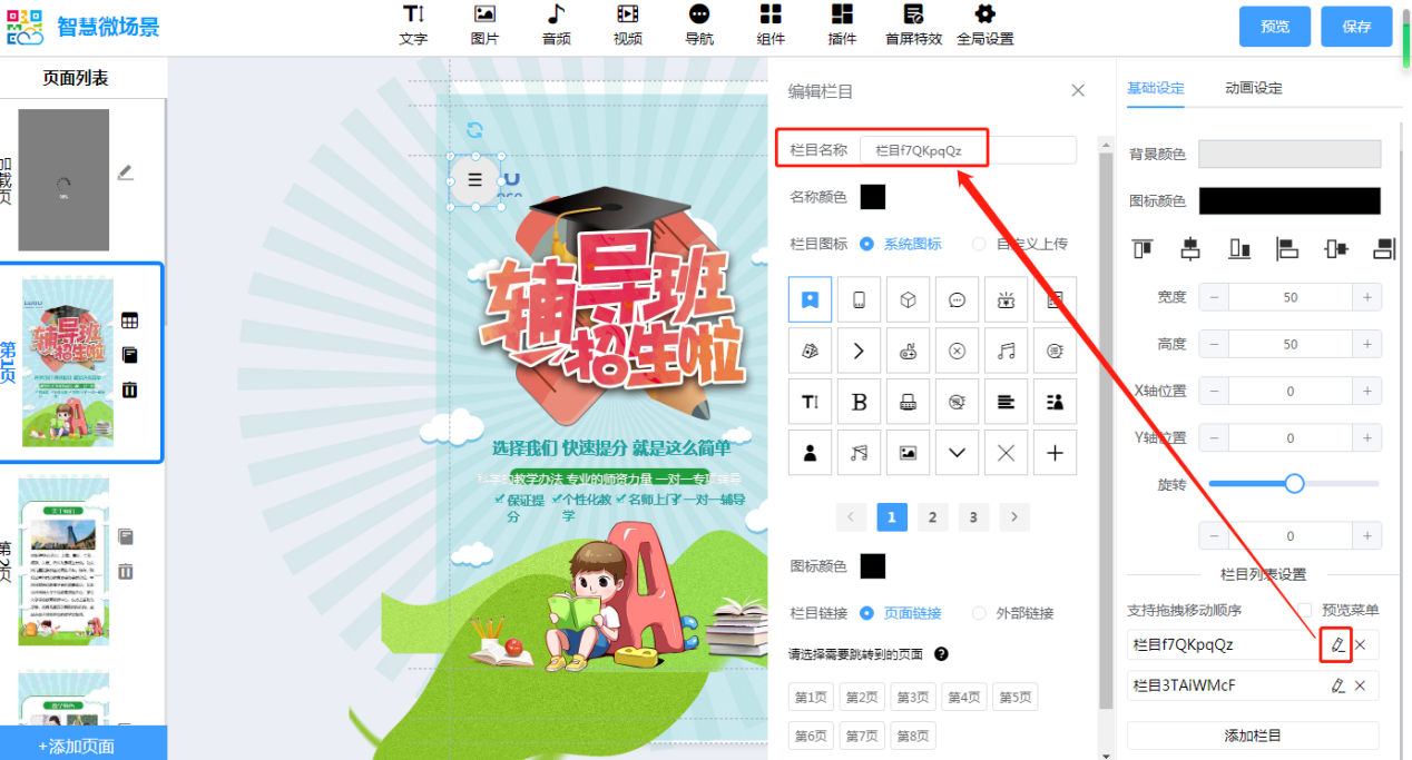 可新增多個欄目,作用為導航導視欄目(針對全頁面展示),修改欄目名稱后,可對應修改設置的跳轉鏈接。如下圖所示: