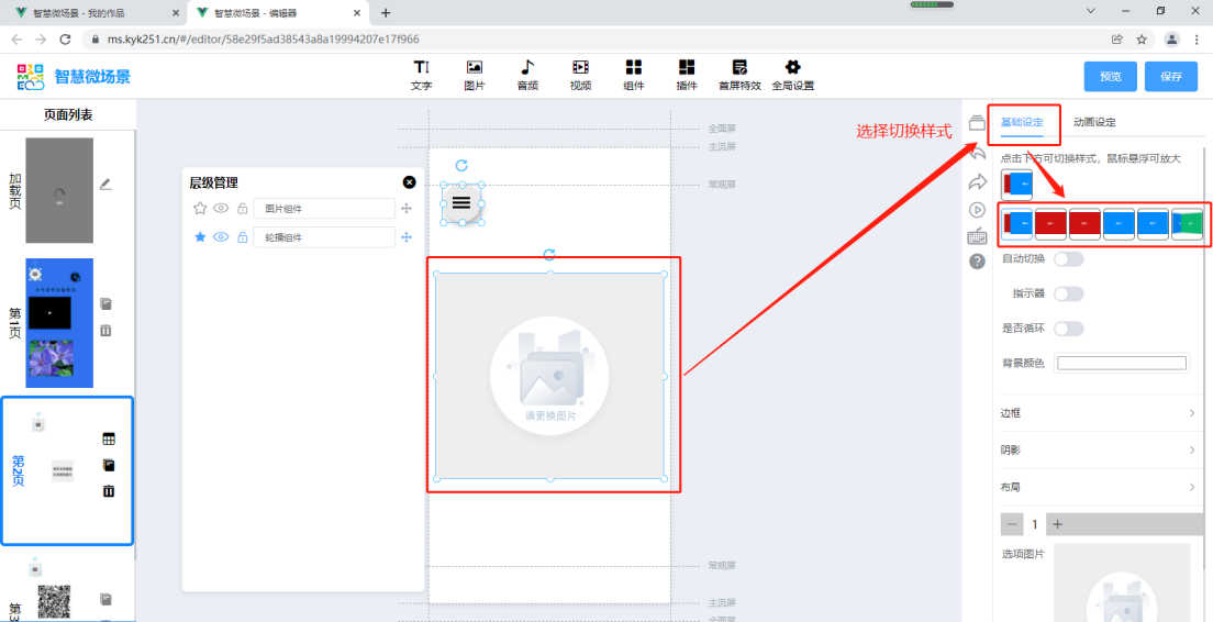 ②輪播,在頁面上增加一個輪播組件,可以對圖片進行輪播的效果,可根據需求切換樣式