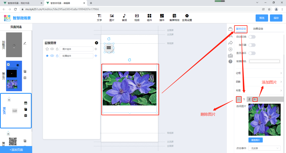 3、我的作品編輯功能主要分為:頁面列表、編輯器、層級管理。如下圖所示:
