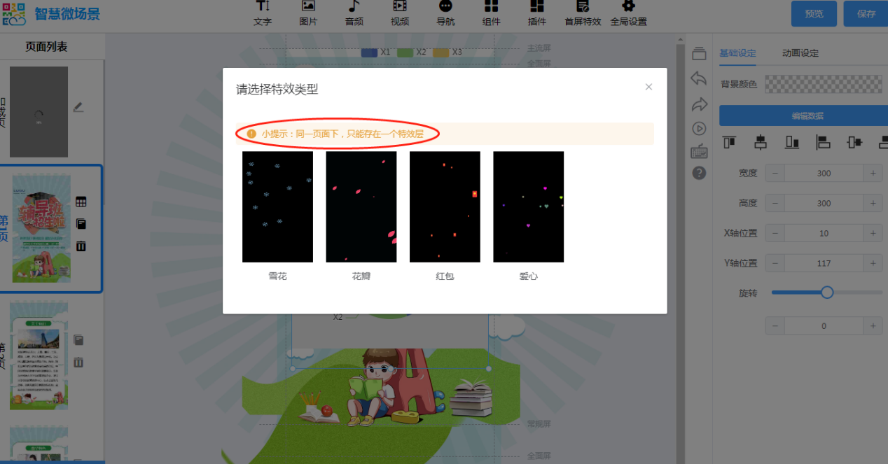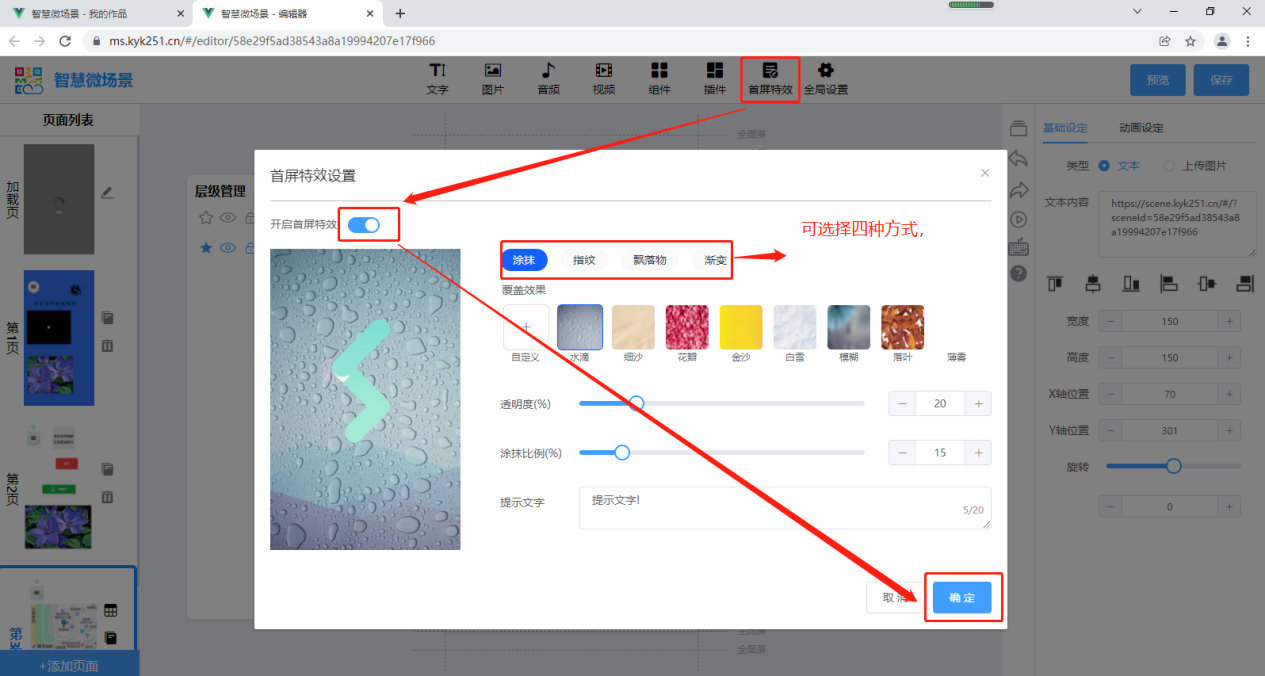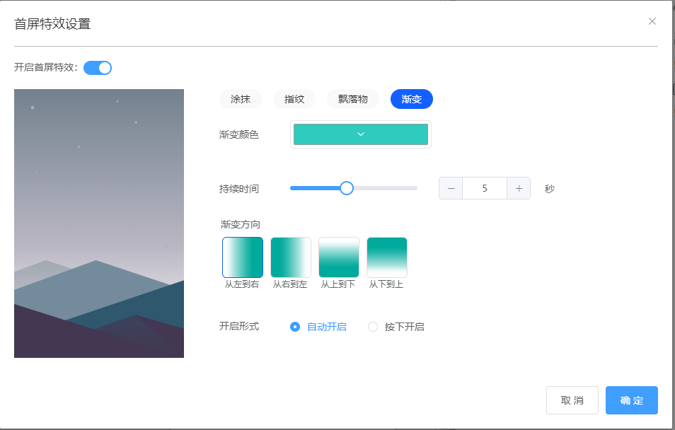 2.8首屏特效組件,點擊“開啟首屏特效”,目前有四種方式:涂抹、指紋、飄落物、漸變。