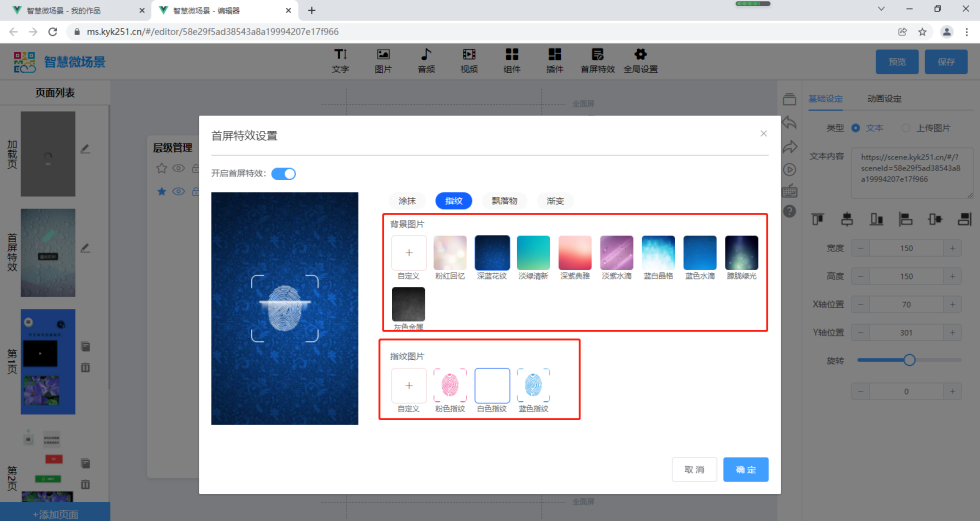 ②指紋:指紋主要由背景圖片和指紋圖片構成,可自定義上傳。