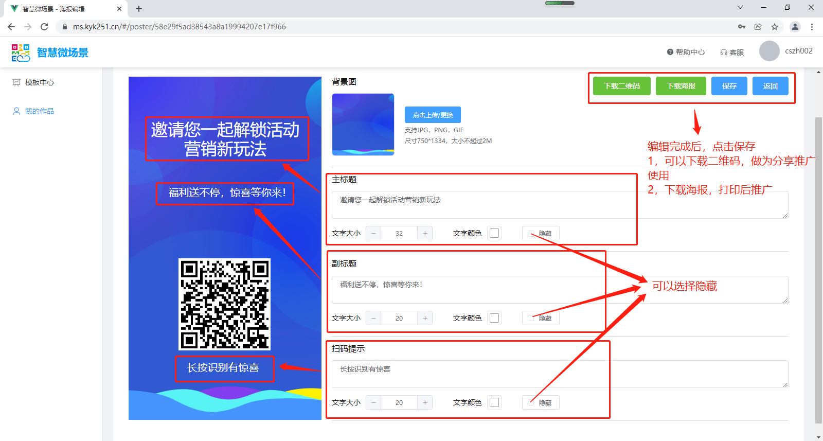 可以編輯主標題、副標題、掃碼提示等的內容編輯、字體大小、文字顏色。選擇是否隱藏。