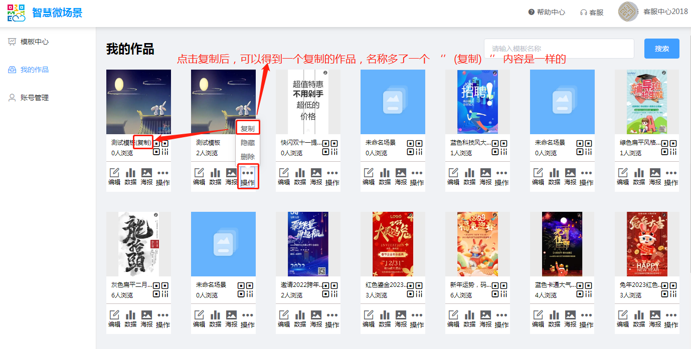 復制作品:點擊我的作品-操作-復制,可以得到一個復制的作品,名稱是在原作品名稱下多了一個“(復制)”。如下圖所示: