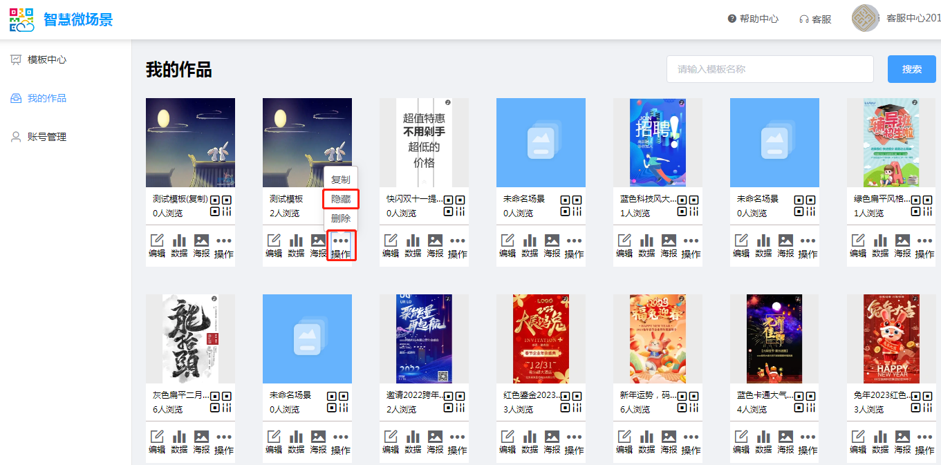 隱藏作品:點擊我的作品-操作-隱藏,隱藏之后列表處仍然會有場景顯示,但掃碼無法正常打開。