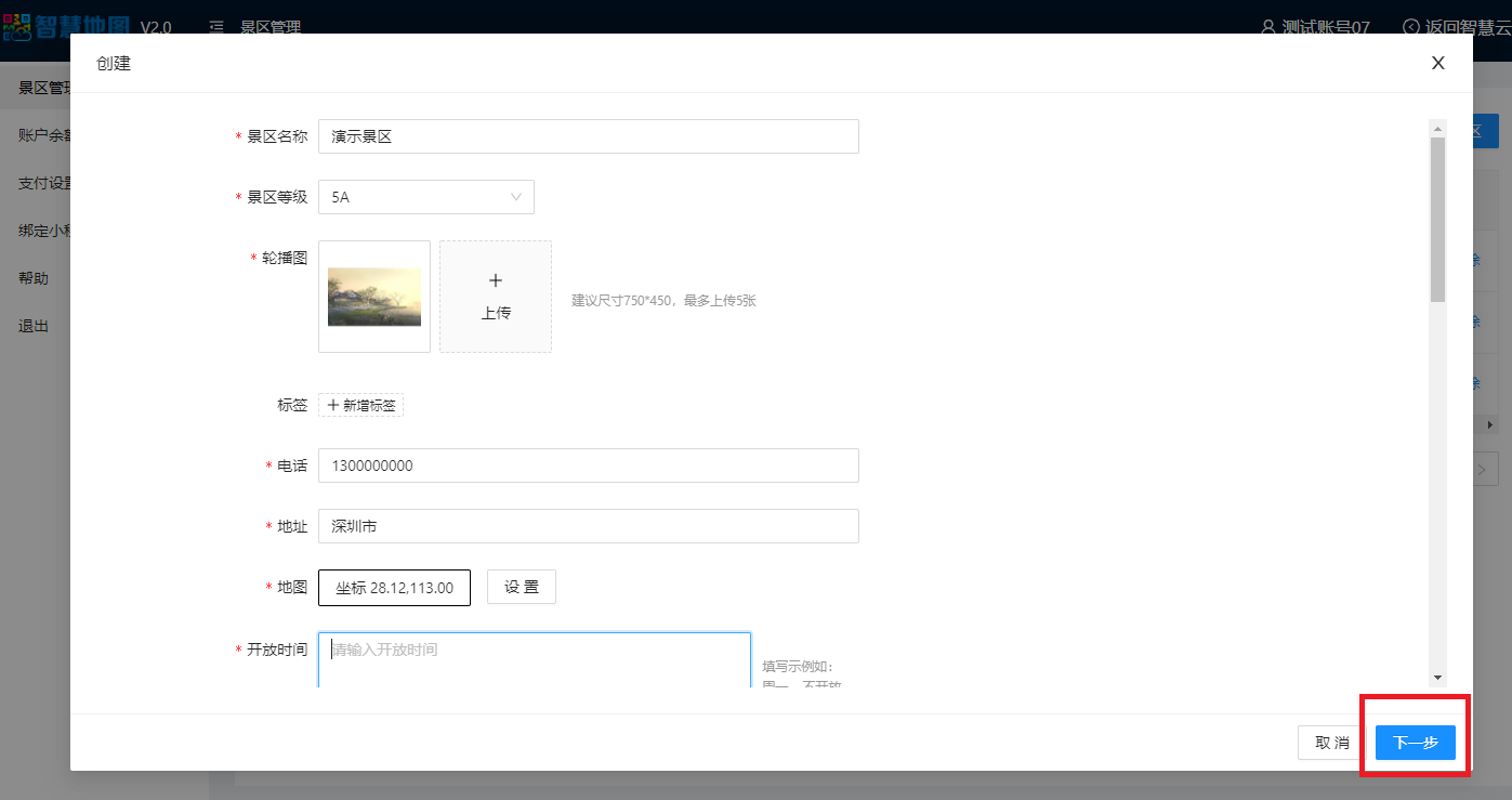 第二步:進入景區創建頁,輸入景區的詳細信息。點擊【下一步】按鈕。如下圖所示: