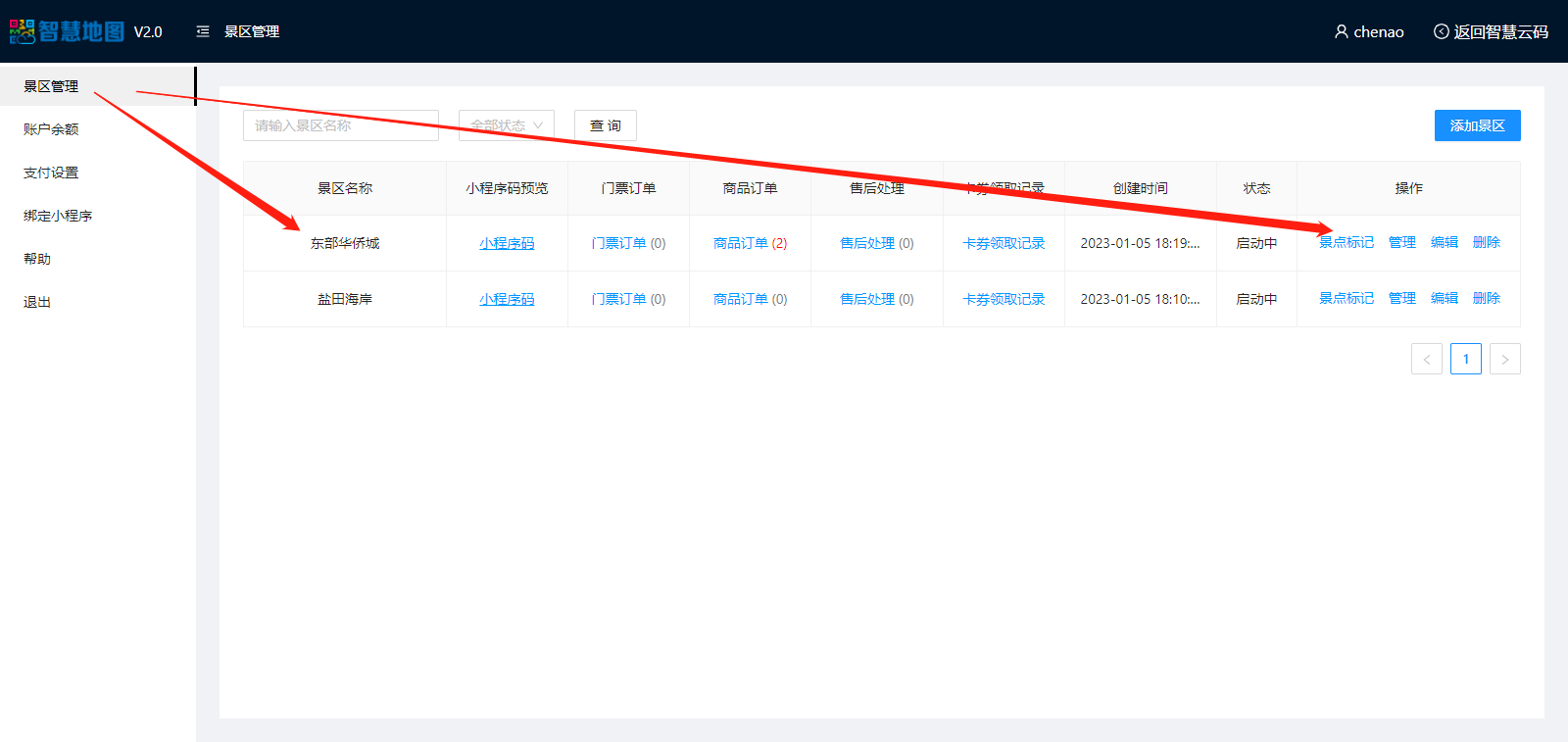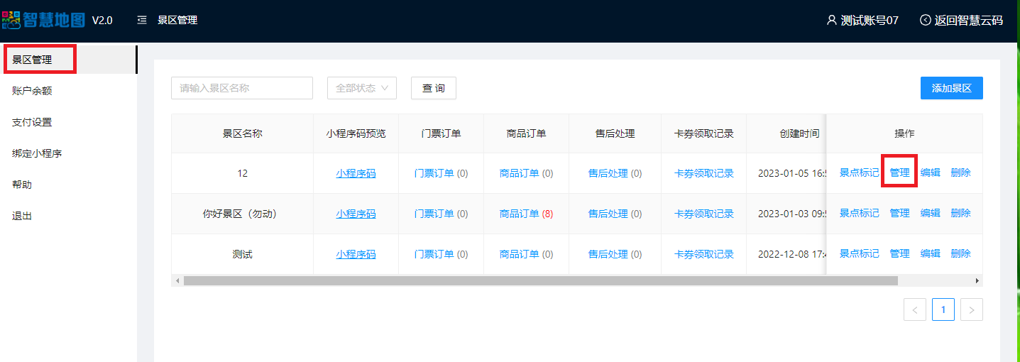 第一步:點擊景區管理中的【管理】。如下圖所示: