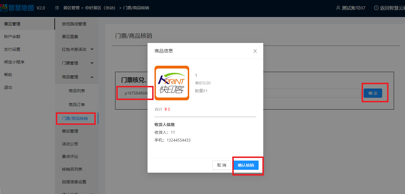 在點擊門票/商品核銷出輸入SN碼,點確認核銷即可完成門票和商品的核銷。如下圖所示: