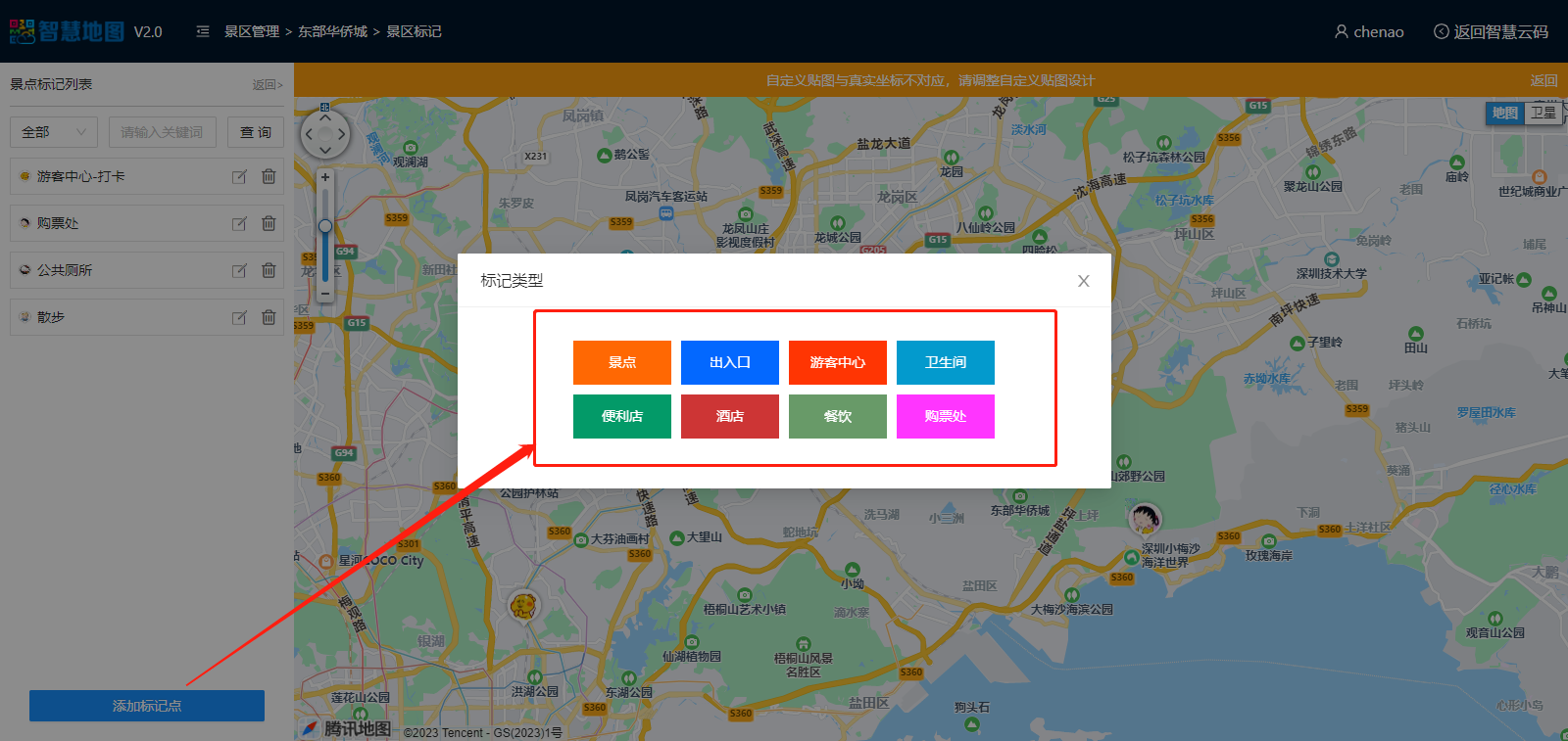第二步:新增景點標記。在景點管理頁面左下角,點擊“添加標記點”,在小彈窗中,有8個選項:景點、出入口、游客中心、衛生間、便利店、酒店、餐飲、購票處。根據需求選擇對應的類型;如下圖所示:
