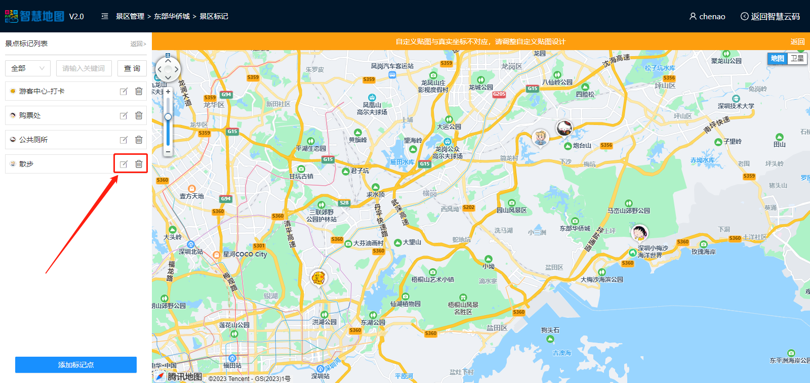 第三步:編輯景點標記。在左側列表,可以看到已添加的標記點,點擊編輯或刪除,可對已有的標記點進行修改。如下圖所示: