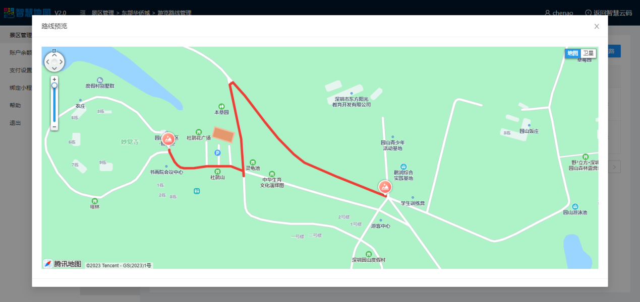 然后在多個景點之間,按順序標記多個坐標,形成自定義的線路(兩個景點之前也要標記多個坐標),點擊路線預覽,生成效果例圖。如下圖所示: