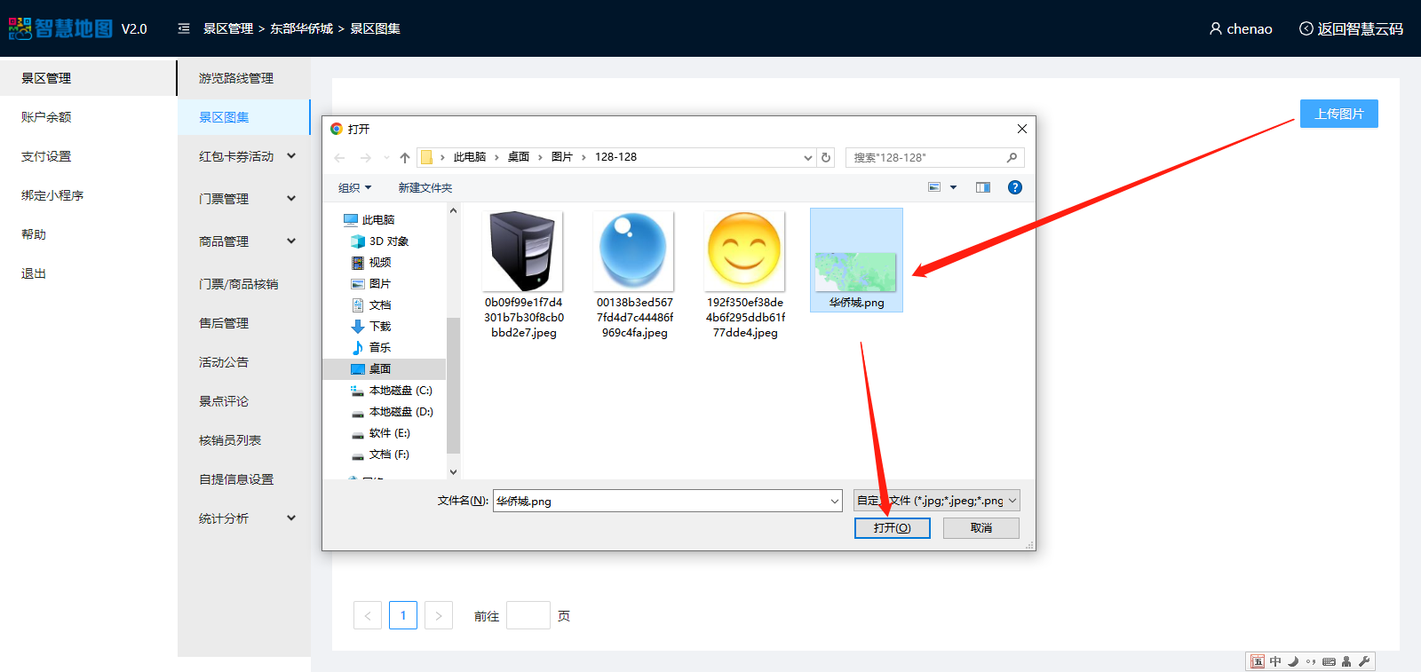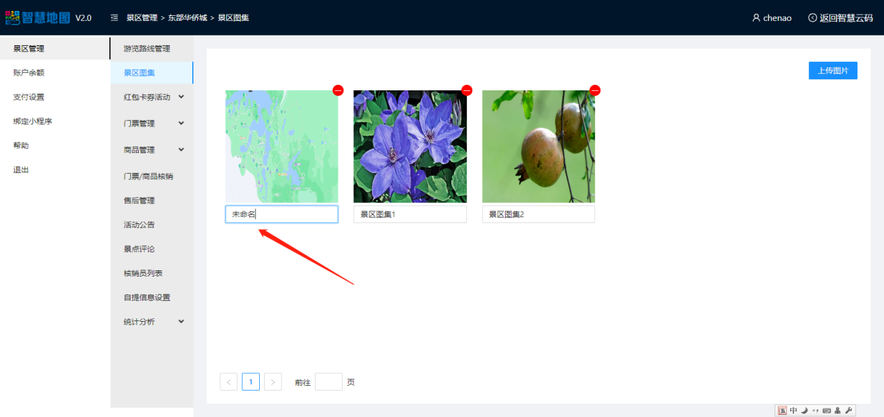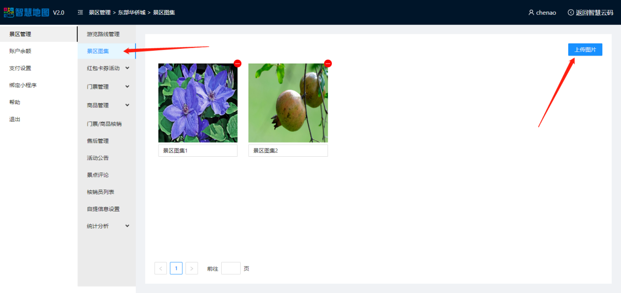 第一步:在景區管理點擊景區圖集,然后點擊上傳圖片。如下圖所示: