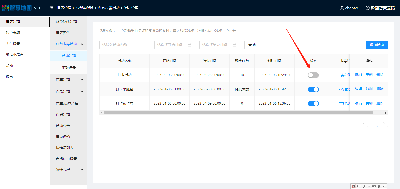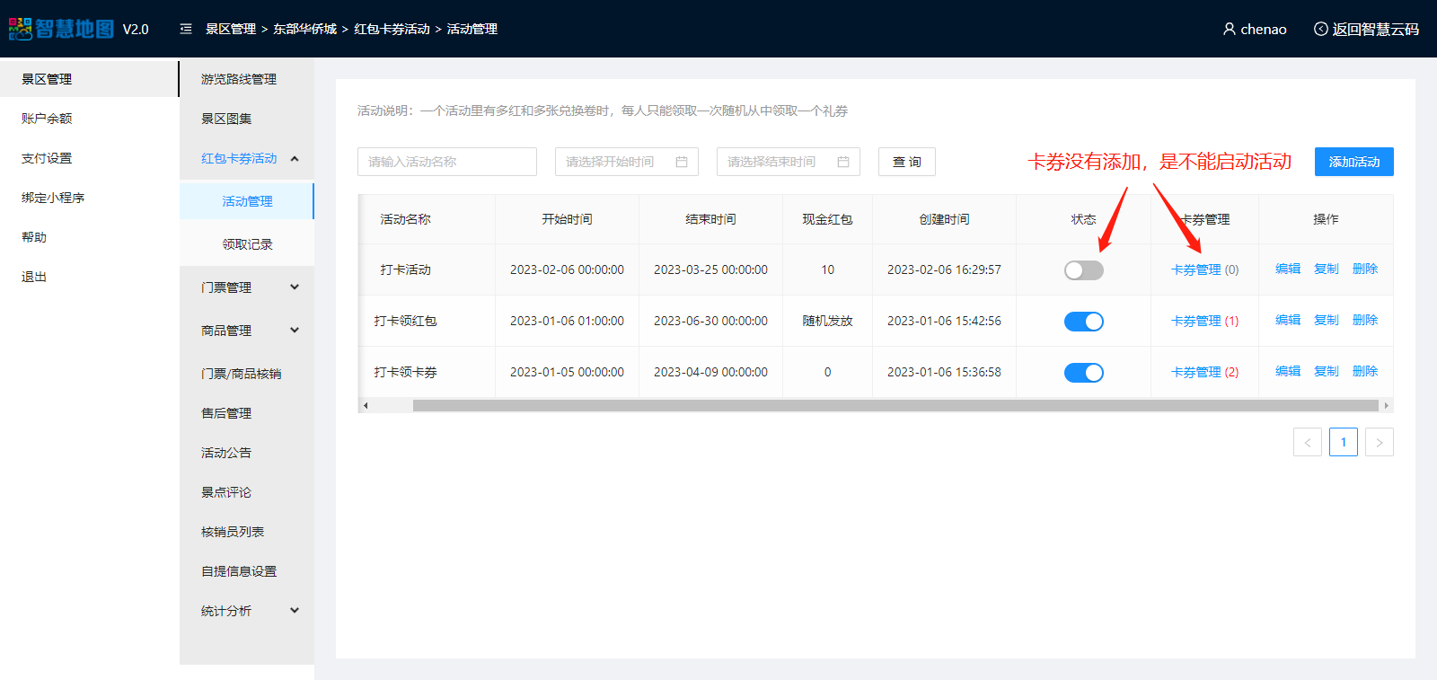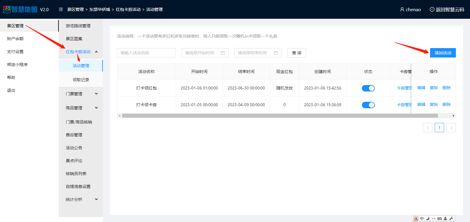第一步:在景區管理點擊紅包卡券活動,再點擊活動管理,最后點擊右上角的添加活動。如下圖所示: