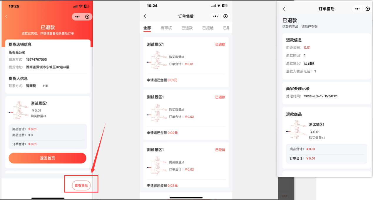 訂單售后有兩個入口,第一可以在訂單詳細內的查看售后進入,第二可在我的界面直接進入售后訂單查看。如下圖所示: