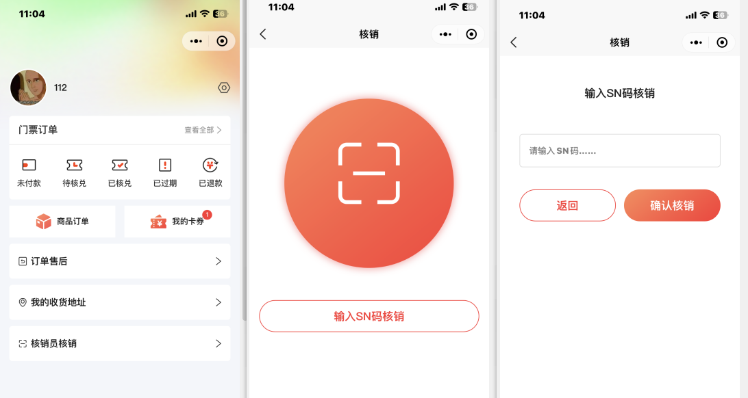 點擊核銷員核銷,進入之后有掃碼核銷和sn碼輸入核銷兩種方式。掃碼核銷是直接核銷不需要確認,sn碼需要點擊確認核銷。(該功能必須申請之后才會顯示)如下圖所示:
