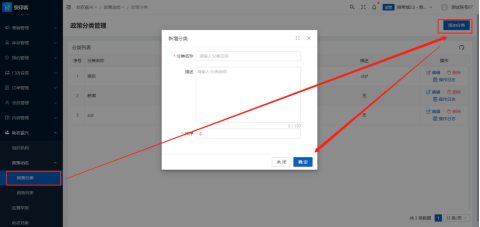 第一步:菜單欄的助農振興-政策動態-政策分類,點擊【添加分類】,填寫分類名稱等信息,