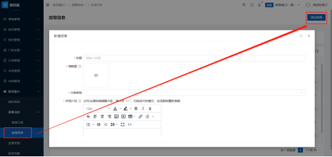 第二步:菜單欄的助農振興-政策動態-政策列表,點擊【添加政策】,填寫政策信息、選擇分類等,最后點擊【提交數據】。如下所示: