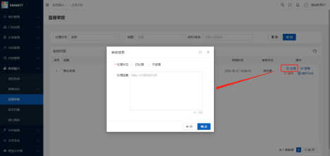 第二步:選擇對應的監督舉報,點擊右邊的“處理”。選擇處理方式及填寫處理回復,點擊【確定】即可處理。如下所示: