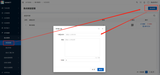 第一步:添加類型。菜單欄的鄉村旅游-景點管理-類型管理,點擊【添加類型】,填寫類型名稱等信息。(注:已有類型名稱,可不添加)如下所示: