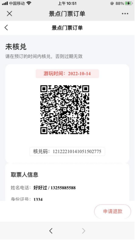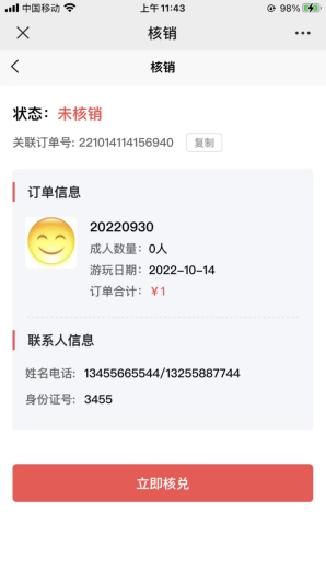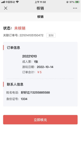 注:核銷密碼是用于進入景點時,核銷門票使用的。如下所示: