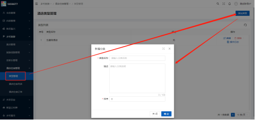 第一步:添加類型。菜單欄的鄉村旅游-酒店住宿管理-類型管理,點擊“添加類型”,填寫類型名稱等信息。(注:已有類型名稱,可不添加)如下所示: