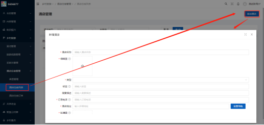 第二步:添加酒店住宿。菜單欄的鄉村旅游-酒店住宿管理-酒店住宿列表,點擊【添加酒店】,填寫酒店名稱、核銷密碼等信息,然后點擊【保存并去設置客房】。