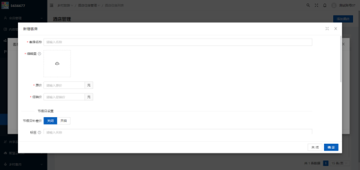 第三步:進入客房管理界面(也可以在酒店住宿列表的客房管理進入),點擊【添加】,填寫客房名稱、價格、房間數、可住人數等信息,然后再點擊【確定】。如下所示: