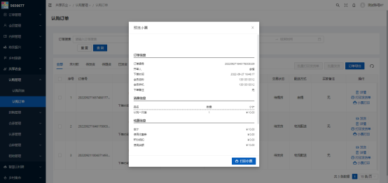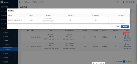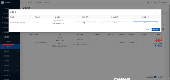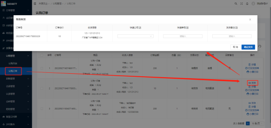 第一步:點擊顧客已支付的認購訂單,點擊【發貨】。選擇快遞公司并輸入快遞單號,點擊【確認發貨】。如下所示: