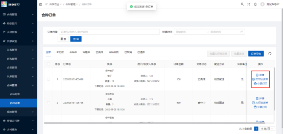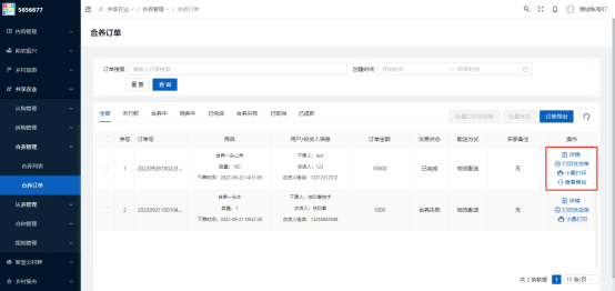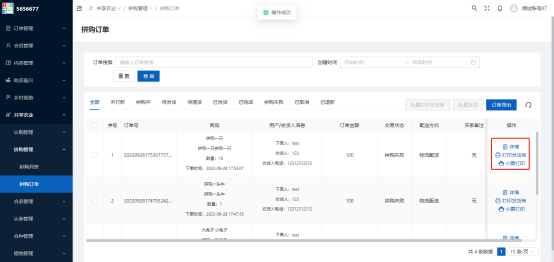 菜單欄的共享農業-合種管理-合種訂單,這里有所有的拼購訂單,可以根據條件進行查詢。如下所示: