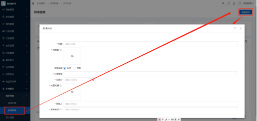 第二步:供求列表。菜單欄的鄉村集市-供求列表-供求列表,點擊右上角的【添加供求】,填寫標題、交易價、聯系人等信息,點擊【提交數據】。如下所示: