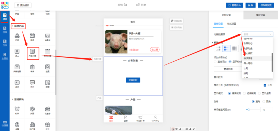 第二步:進入編輯器后,選擇模塊-信息產品-內容列表,在內容數據源里,選擇自己想要的數據源。(數據源包含助農振興的組織機構、政策動態、助農對象、愛心捐款)如下所示: