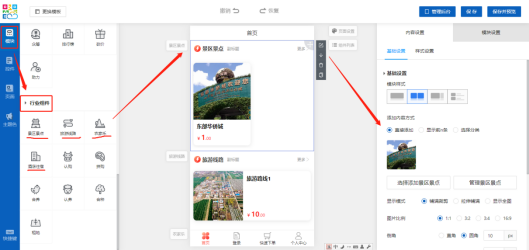 進入編輯器后,選擇模塊-行業組件,可以看到相應的組件(景區景點、旅游線路、農家樂、酒店住宿),點擊組件后,可以在編輯頁生成一個窗口,然后就可以設置對應的信息(例如設置樣式、添加景點、設置顯示模塊等)。如下所示: