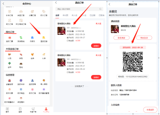 查看訂單信息及核銷:在最下面的導航欄,點擊個人中心,下拉到最下面,可看到預約訂單、共享農村訂單。