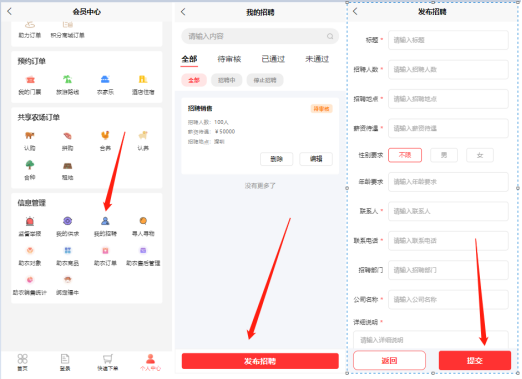 在個人中心-信息管理-我的招聘,點擊發布招聘,填寫對應的信息,點擊提交。如下所示: