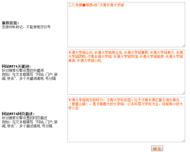 網(wǎng)站META關(guān)鍵詞、網(wǎng)站META頁面描述:是針對搜索引擎設(shè)置的關(guān)鍵詞、描述;例如:在文本框填寫 "網(wǎng)站,門戶,新聞,快訊",多個關(guān)鍵詞請用,號分隔
