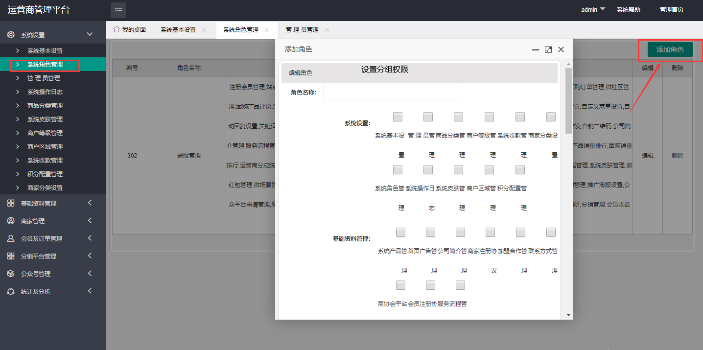 可在此處為不同的管理員設(shè)置不同的角色,角色可根據(jù)分工不同而分配相應(yīng)的管理權(quán)限。如下圖所示: