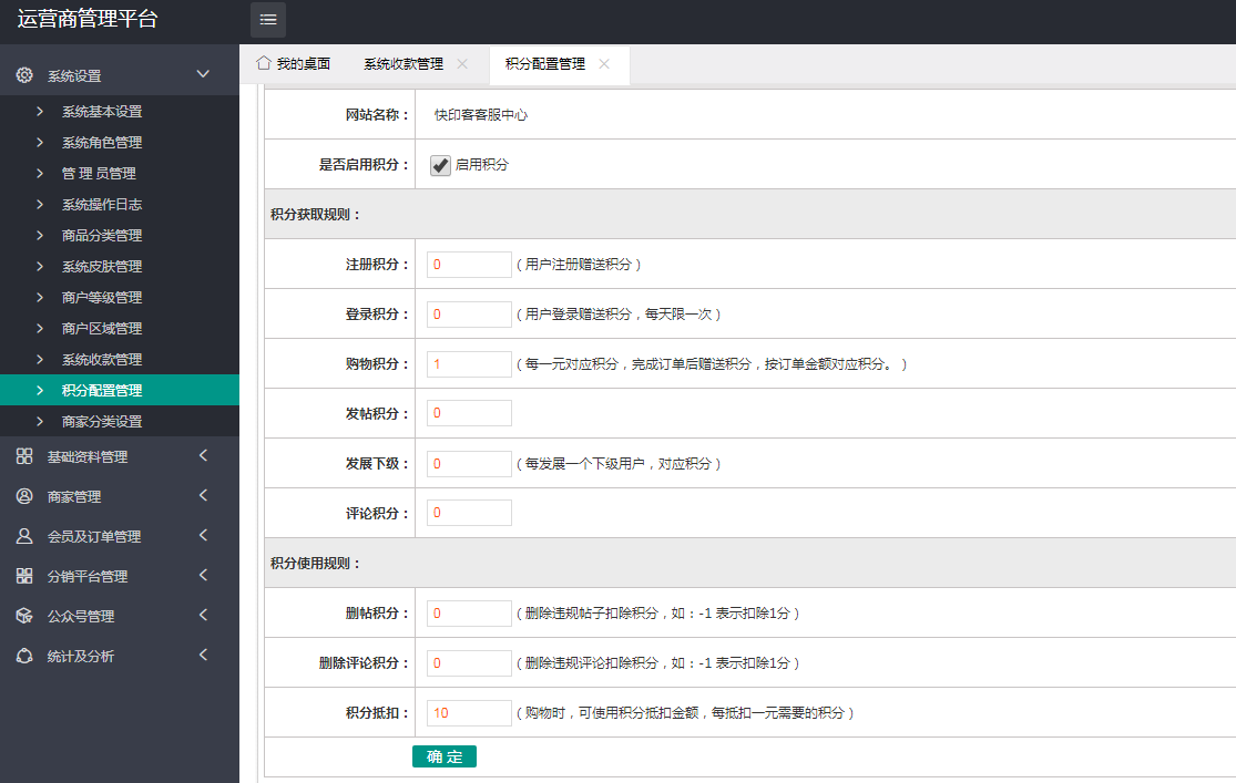 積分分配管理設(shè)置獲取積分和積分使用的規(guī)則,一旦要使用,必須要進行勾選啟用積分,否則積分無法積累和使用。積分可用于購物時積分抵扣和積分商城兌換獎品。如下圖所示: