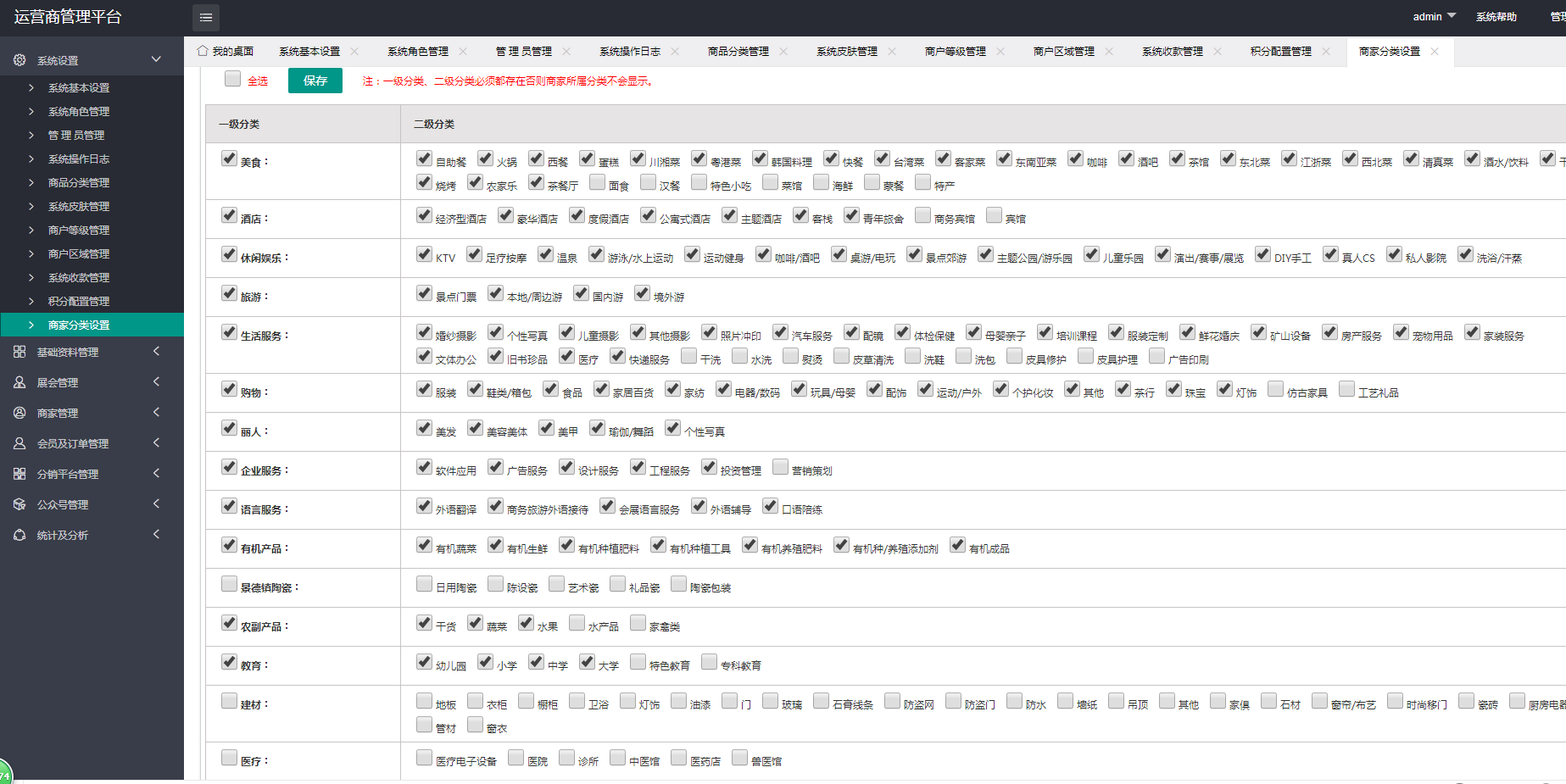 商家分類可根據(jù)不同商家所屬分類勾選系統(tǒng)已有分類,因商家分類不能由運營商自行添加,故有其他分類需求的可和客服老師提出,同時1級分類下不少于5個子分類。如下圖所示:
