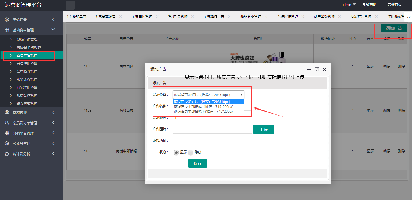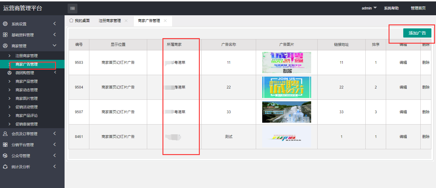 所有商家商鋪的幻燈片廣告列表!商家通過商家后臺上傳的幻燈片廣告也會統(tǒng)一出現(xiàn)在這個頁面,同時作為平臺運營商,也可以直接進行添加商家的幻燈片廣告。如下圖所示: