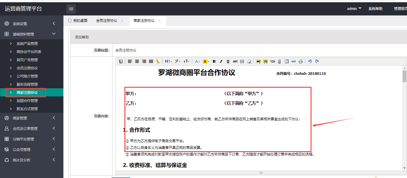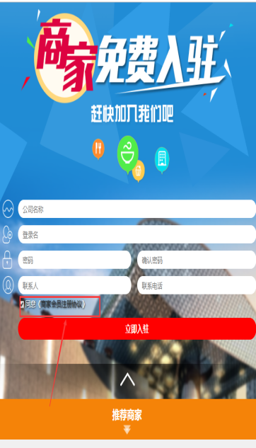 商家注冊協(xié)議是給到商家在申請免費入駐時,在注冊頁面出現(xiàn)的,一旦注冊,則默認(rèn)已經(jīng)了解本協(xié)議,您可根據(jù)需要,編寫修改相應(yīng)的內(nèi)容。如下圖所示: