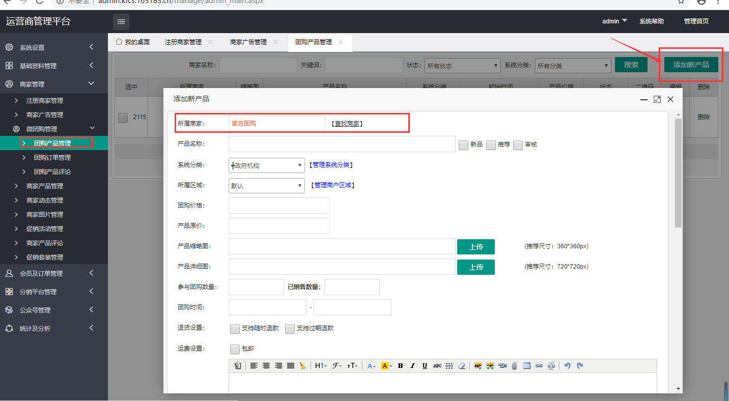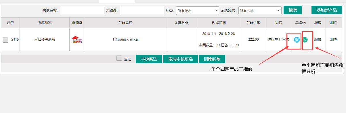 團購產(chǎn)品必須進行審核才可以顯示到首頁團購版塊。團購分為官方團購或商家管理后臺添加的某個商鋪的團購,根據(jù)實際情況,按照添加團購內(nèi)容進行添加。添加完畢后,確認(rèn)此團購產(chǎn)品沒有任何虛假宣傳和產(chǎn)品質(zhì)量問題時,可勾選審核。同時在團購產(chǎn)品列表,顯示所有團購產(chǎn)品,可加載單個團購產(chǎn)品二維碼及單個團購產(chǎn)品的銷售數(shù)據(jù)分析。如下圖所示: