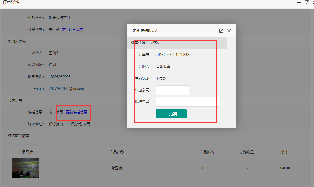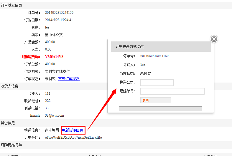 亦可在此對商家的訂單狀態(tài)做出更改,如發(fā)貨信息、訂單狀態(tài)等,而商家后臺管理只能修改該商家自己的訂單狀態(tài)。如下圖所示: